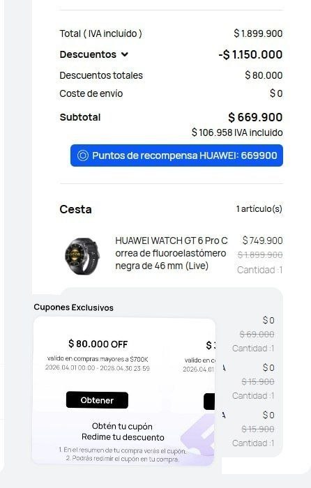 ➡️ $ 669.900 HUAWEI WATCH GT 6 Pro Live HUAWEI WATCH GT 6 Pro Correa de fluoroelastómero negra de 46 mm (Live) Comprar en huawei https://joylink.io/clubgratis/ywd43Fx Para obtener ese precio primero se van a la página de Huawei live https://joylink.io/clubgratis/AwtsIan y ahí en cupones reclaman el de 80.000 Compartido por Omar ortiz Aportes con @Aclubgrabot
